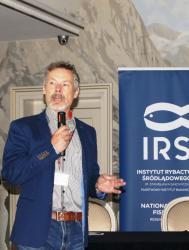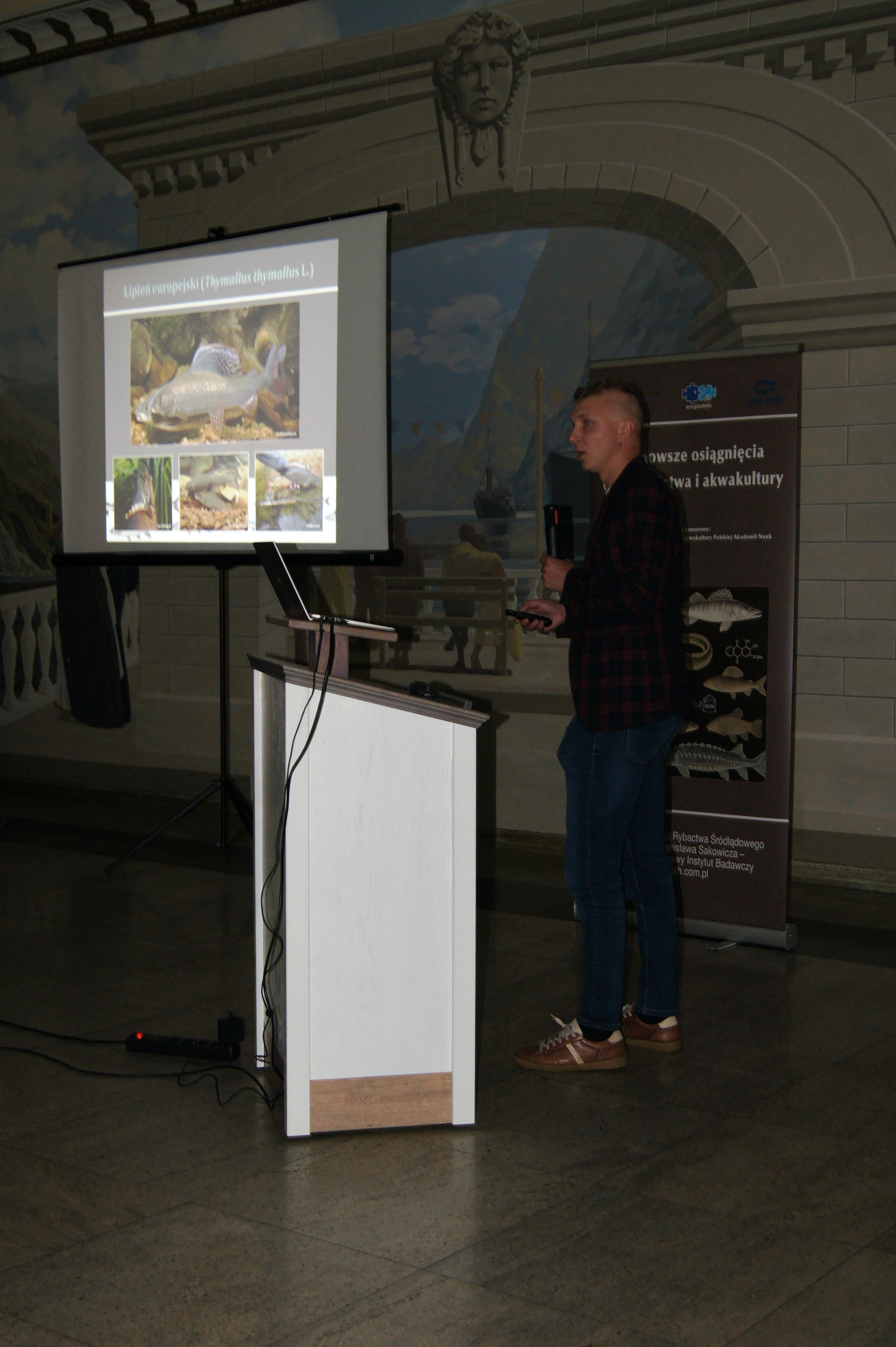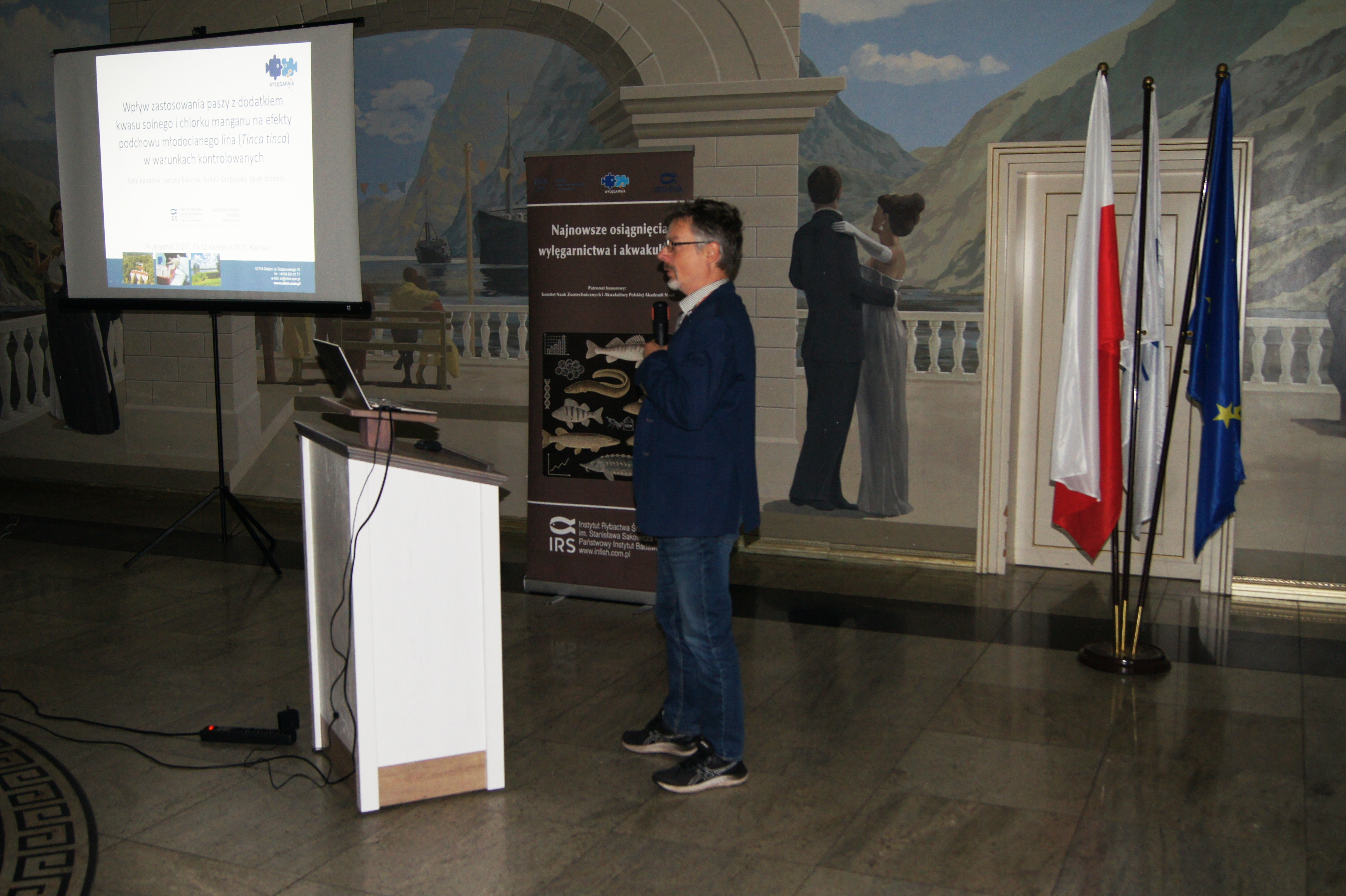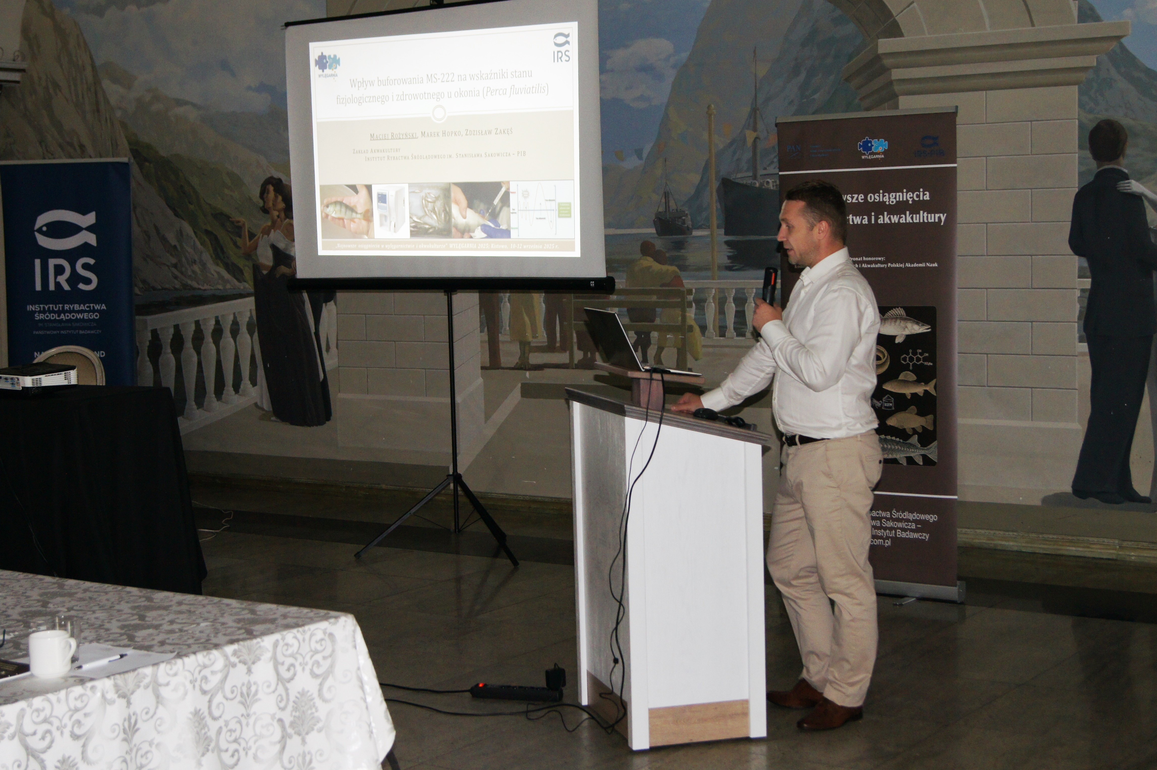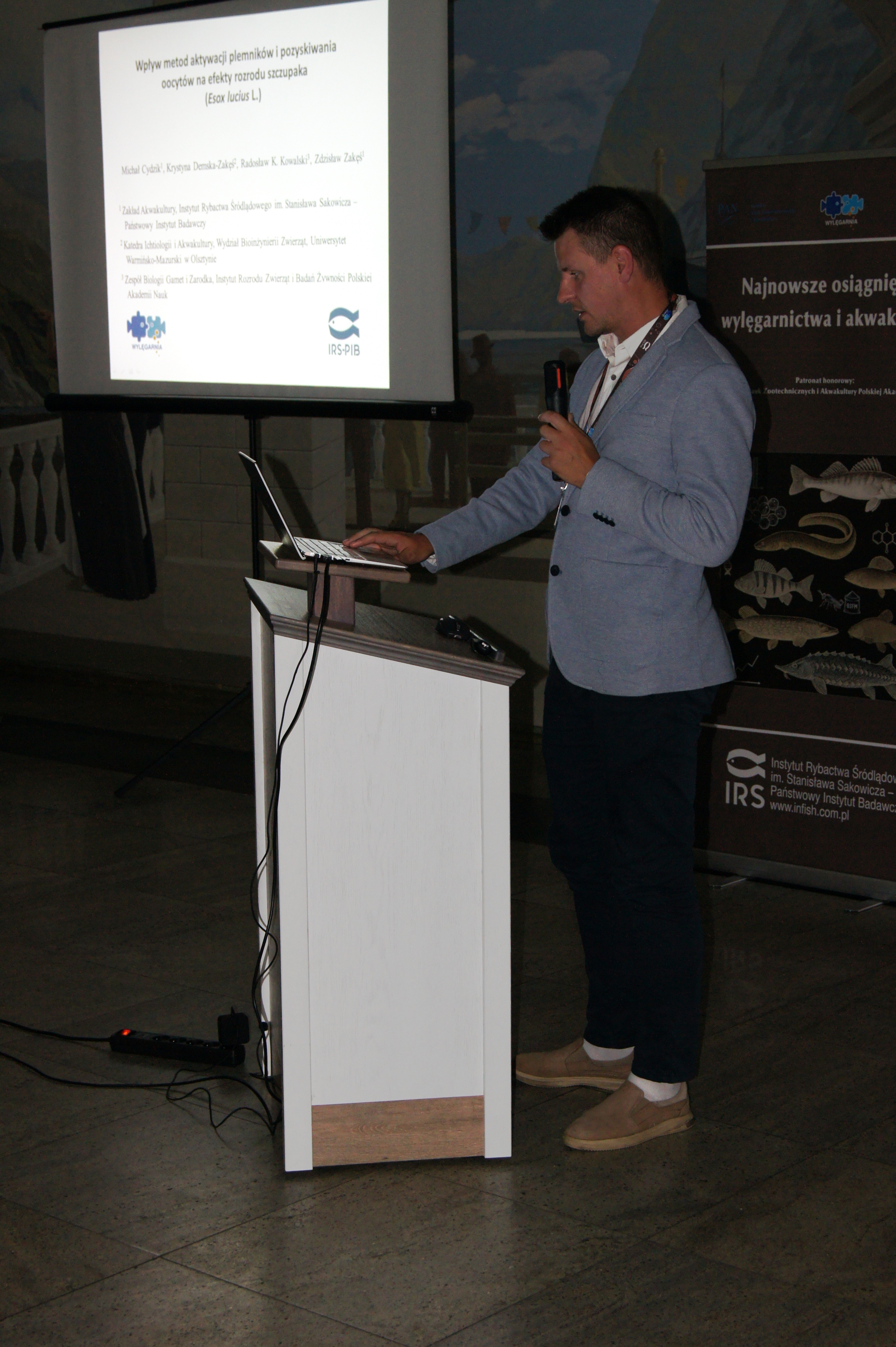 Konferencja została otworzona przez dr Macieja Rożyńskiego oraz dr hab. Agatę Cejko, którzy podkreślili znaczenie integracji środowisk naukowych i hodowlanych oraz potrzebę wspólnego wypracowywania rozwiązań odpowiadających na dynamicznie zmieniające się warunki gospodarcze i ekologiczne (fot. 5). W ramach konferencji odbyły się trzy sesje referatowe, podczas których zaprezentowano łącznie 14 wystąpień naukowych. Pierwsza sesja, moderowana przez dr Macieja Rożyńskiego, poświęcona była zagadnieniom żywienia ryb oraz innowacjom w zakresie produkcji pasz. Dr hab. Agata Cejko przedstawiła wyniki badań dotyczących wpływu różnych źródeł lipidów na wzrost, zdrowie i jakość mięsa jesiotra (fot. 6). Szczególną uwagę poświęciła alternatywnym źródłom lipidów – takim jak olej z alg, amarantusa czy lnianki – oraz ich profilowi kwasów tłuszczowych, ze wskazaniem na korzystne działanie LC-PUFA (DHA i EPA) na odporność, parametry rozrodu i wartość odżywczą ryb. Dr hab. Piotr Hliwa zaprezentował badania nad immersyjnym znakowaniem narybku węgorza europejskiego (Anguilla anguilla) z wykorzystaniem barwników fluorescencyjnych – alizaryny red S i kalceiny (fot. 7). Obie metody cechują się wysoką skutecznością, brakiem negatywnego wpływu na przeżywalność i wzrost ryb oraz potencjałem zastosowania w praktyce hodowlanej i monitoringu populacji ryb. Kolejny referat, autorstwa dr hab. Jana Mazurkiewicza z Uniwersytetu Przyrodniczego w Poznaniu, dotyczył wykorzystania mączki z owadów (Hermetia illucens) jako zamiennika mączki rybnej w żywieniu jesiotra ostronosego (Acipenser oxyrinchus) (fot. 8). Wyniki badań wykazały przeżywalność młodocianych osobników na poziomie 100% oraz brak negatywnych efektów biologicznych, co czyni mączkę owadzią obiecującym komponentem paszowym w zrównoważonej akwakulturze. Następnie dr hab. Rafał Kamiński z Zakładu Rybactwa Stawowego w Żabieńcu IRS-PIB przedstawił wpływ dodatku kwasu solnego i chlorku manganu do paszy na wzrost, kondycję oraz występowanie deformacji ciała u młodocianego lina (Tinca tinca) w warunkach kontrolowanych (fot. 9). Autor wystąpienia podkreślił możliwość optymalizacji składu pasz w celu poprawy wyników hodowlanych. Po przerwie kawowej rozpoczęła się druga sesja, moderowana przez dr hab. Agatę Cejko. Dr Marek Trella z Zakładu Bioekonomiki Rybactwa IRS-PIB zaprezentował kompleksowe podejście do zarządzania populacją szczupaka (Esox lucius), uwzględniające aspekty ekologiczne, ekonomiczne i społeczne (fot. 10). Wystąpienie podkreśliło znaczenie racjonalizacji gospodarki zarybieniowej oraz potrzebę wdrażania innowacji w biotechnice rozrodu tego gatunku. Mgr Rafał Rożyński, doktorant Uniwersytetu Gdańskiego i pracownik Zakładu Hodowli Ryb Łososiowatych w Rutkach, przedstawił porównanie triploidalnych i diploidalnych osobników lipienia europejskiego (Thymallus thymallus) pod względem rozwoju gonad oraz markerów zdrowotnych (fot. 11). Wyniki sugerują, że triploidy mogą stanowić bezpieczne narzędzie w ochronie dzikich populacji tego gatunku. Kolejne dwa referaty wygłosili pracownicy Zakładu Akwakultury IRS-PIB. Pierwszy z nich wygłosił mgr Michał Cydzik i dotyczył on metod pobierania oocytów oraz wpływ rodzaju płynu aktywującego plemniki na efektywność rozrodu szczupaka (fot. 12). Natomiast drugi, wygłoszony przez dr Macieja Rożyńskiego omawiał znaczenie buforowania anestetyku MS-222 na przykładzie okonia (Perca fluviatilis) (fot. 13). Pierwszy dzień konferencji zakończył się sesją posterową, podczas której zaprezentowano 9 plakatów (fot. 14 i 15)