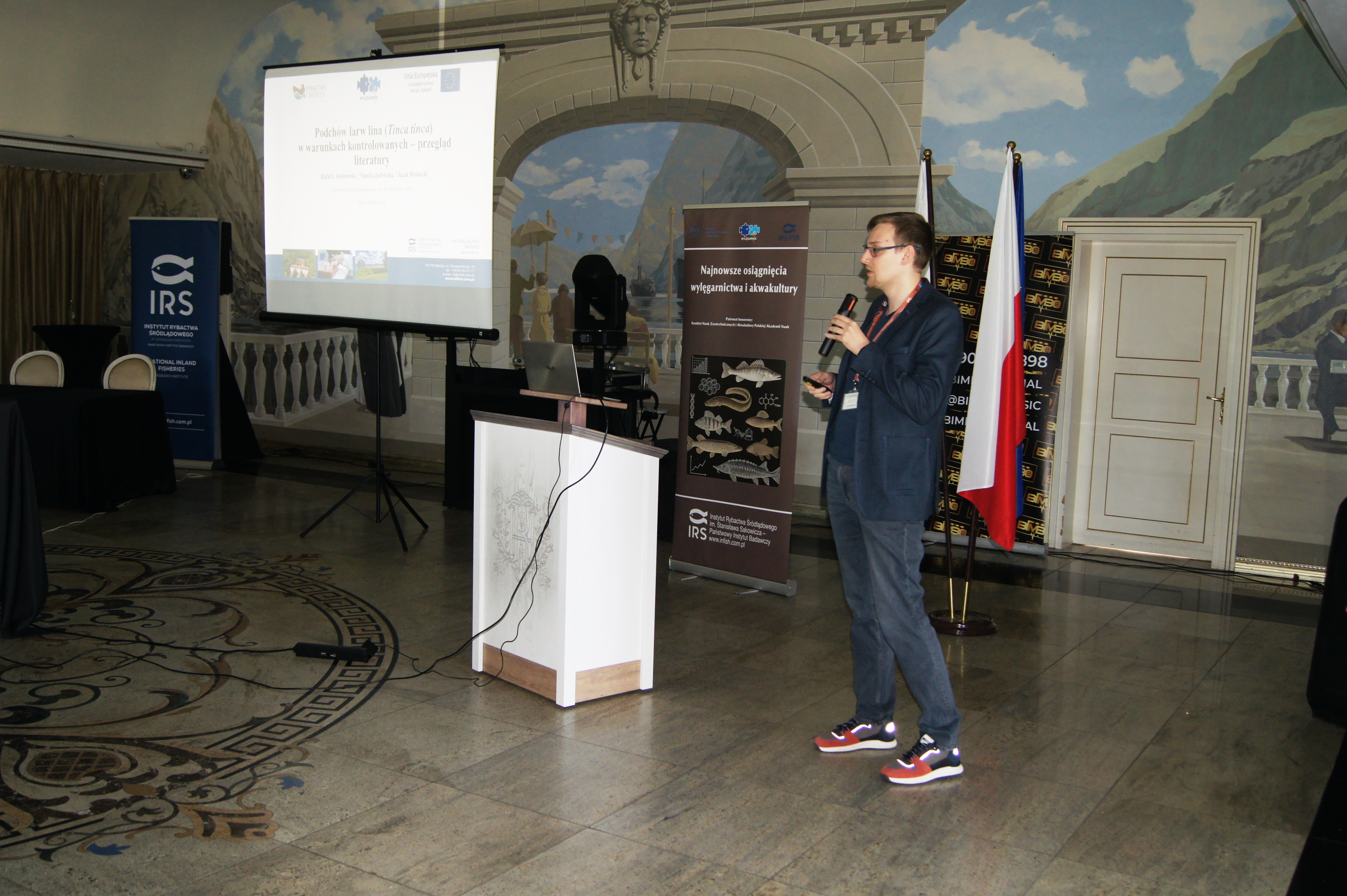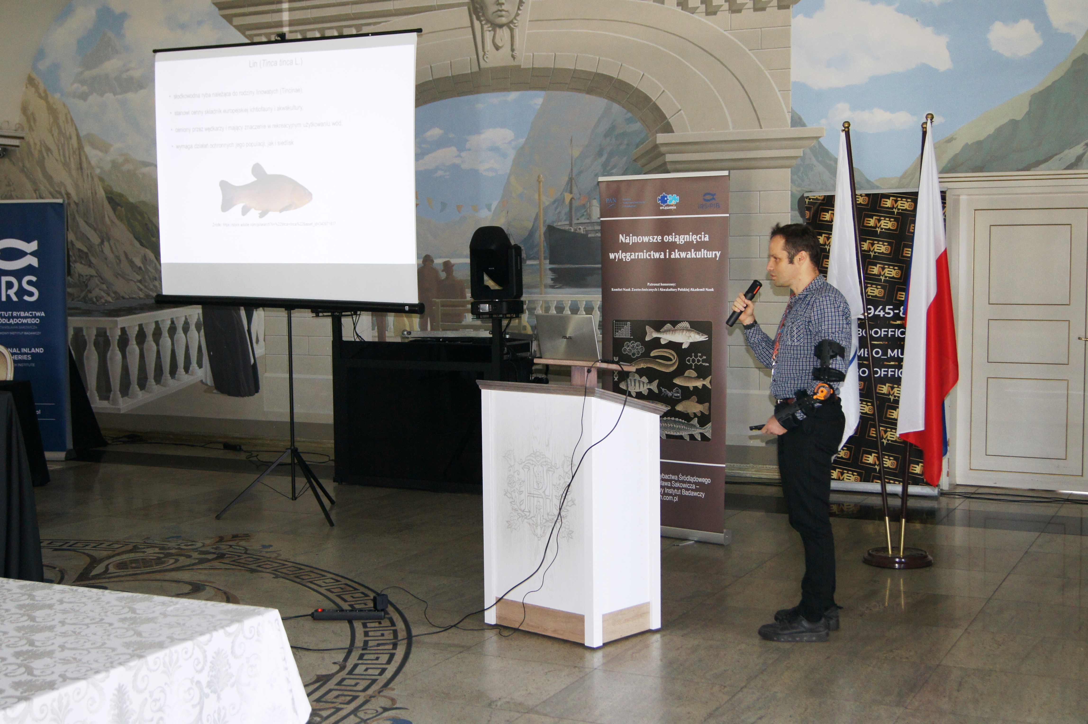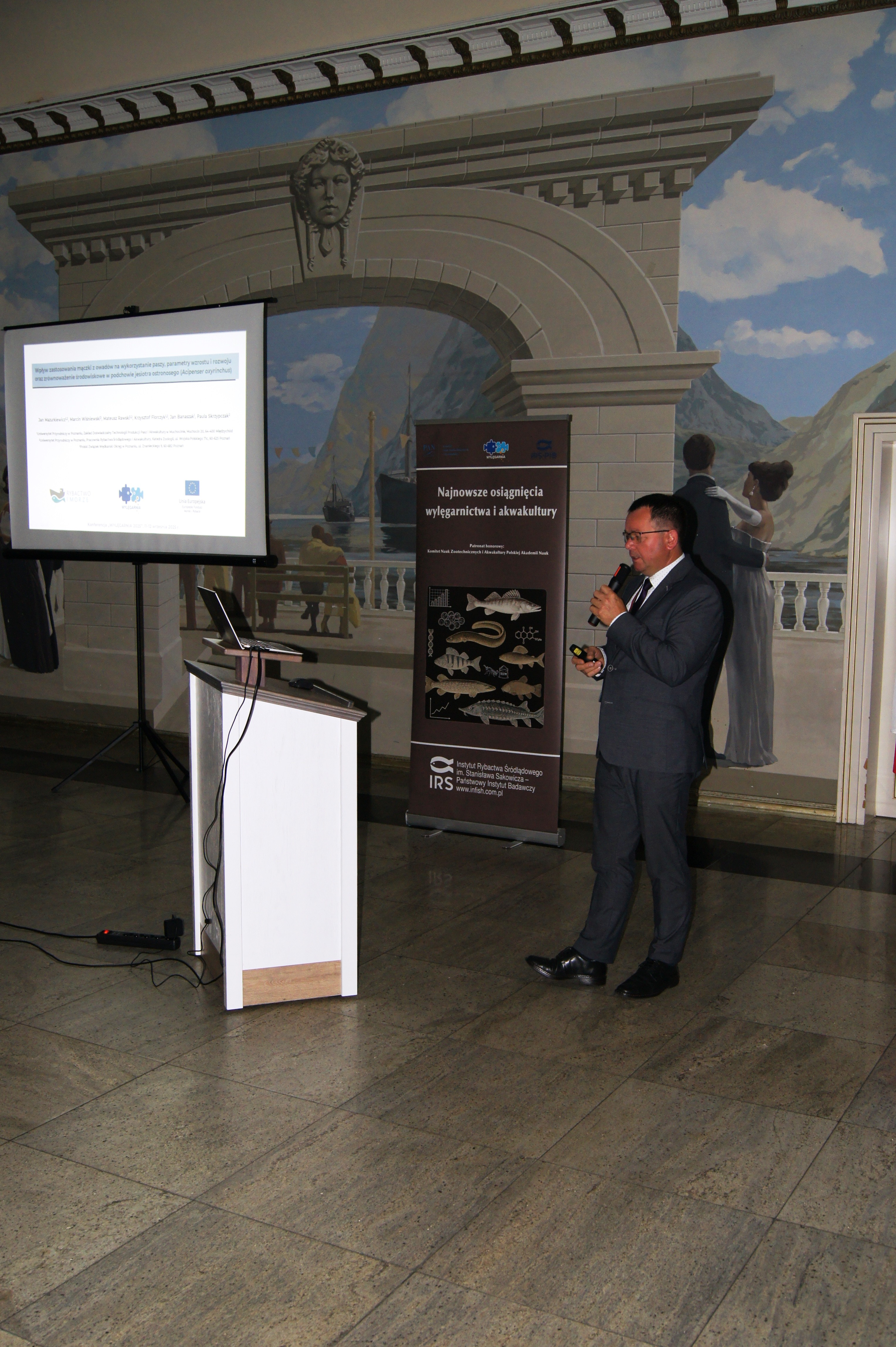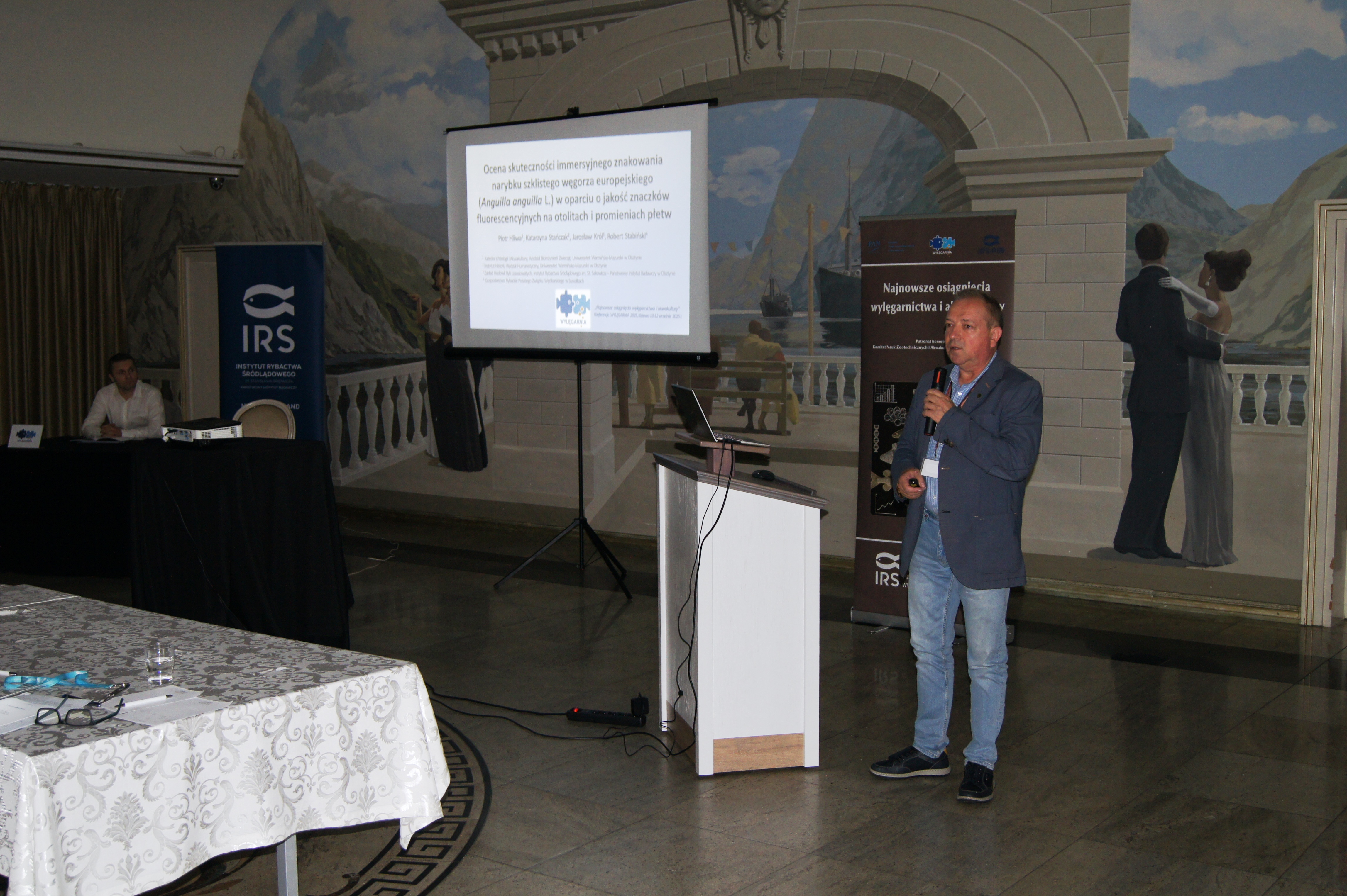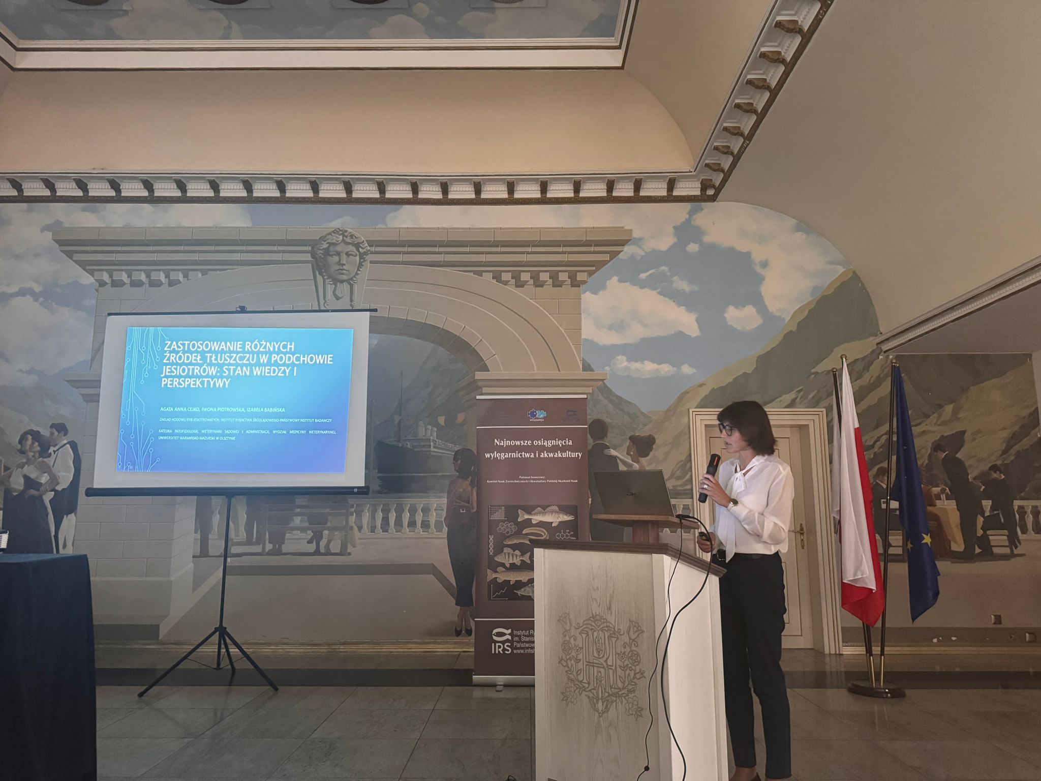 Konferencja została otworzona przez dr Macieja Rożyńskiego oraz dr hab. Agatę Cejko, którzy podkreślili znaczenie integracji środowisk naukowych i hodowlanych oraz potrzebę wspólnego wypracowywania rozwiązań odpowiadających na dynamicznie zmieniające się warunki gospodarcze i ekologiczne (fot. 5). W ramach konferencji odbyły się trzy sesje referatowe, podczas których zaprezentowano łącznie 14 wystąpień naukowych. Pierwsza sesja, moderowana przez dr Macieja Rożyńskiego, poświęcona była zagadnieniom żywienia ryb oraz innowacjom w zakresie produkcji pasz. Dr hab. Agata Cejko przedstawiła wyniki badań dotyczących wpływu różnych źródeł lipidów na wzrost, zdrowie i jakość mięsa jesiotra (fot. 6). Szczególną uwagę poświęciła alternatywnym źródłom lipidów – takim jak olej z alg, amarantusa czy lnianki – oraz ich profilowi kwasów tłuszczowych, ze wskazaniem na korzystne działanie LC-PUFA (DHA i EPA) na odporność, parametry rozrodu i wartość odżywczą ryb. Dr hab. Piotr Hliwa zaprezentował badania nad immersyjnym znakowaniem narybku węgorza europejskiego (Anguilla anguilla) z wykorzystaniem barwników fluorescencyjnych – alizaryny red S i kalceiny (fot. 7). Obie metody cechują się wysoką skutecznością, brakiem negatywnego wpływu na przeżywalność i wzrost ryb oraz potencjałem zastosowania w praktyce hodowlanej i monitoringu populacji ryb. Kolejny referat, autorstwa dr hab. Jana Mazurkiewicza z Uniwersytetu Przyrodniczego w Poznaniu, dotyczył wykorzystania mączki z owadów (Hermetia illucens) jako zamiennika mączki rybnej w żywieniu jesiotra ostronosego (Acipenser oxyrinchus) (fot. 8). Wyniki badań wykazały przeżywalność młodocianych osobników na poziomie 100% oraz brak negatywnych efektów biologicznych, co czyni mączkę owadzią obiecującym komponentem paszowym w zrównoważonej akwakulturze. Następnie dr hab. Rafał Kamiński z Zakładu Rybactwa Stawowego w Żabieńcu IRS-PIB przedstawił wpływ dodatku kwasu solnego i chlorku manganu do paszy na wzrost, kondycję oraz występowanie deformacji ciała u młodocianego lina (Tinca tinca) w warunkach kontrolowanych (fot. 9). Autor wystąpienia podkreślił możliwość optymalizacji składu pasz w celu poprawy wyników hodowlanych. Po przerwie kawowej rozpoczęła się druga sesja, moderowana przez dr hab. Agatę Cejko. Dr Marek Trella z Zakładu Bioekonomiki Rybactwa IRS-PIB zaprezentował kompleksowe podejście do zarządzania populacją szczupaka (Esox lucius), uwzględniające aspekty ekologiczne, ekonomiczne i społeczne (fot. 10). Wystąpienie podkreśliło znaczenie racjonalizacji gospodarki zarybieniowej oraz potrzebę wdrażania innowacji w biotechnice rozrodu tego gatunku. Mgr Rafał Rożyński, doktorant Uniwersytetu Gdańskiego i pracownik Zakładu Hodowli Ryb Łososiowatych w Rutkach, przedstawił porównanie triploidalnych i diploidalnych osobników lipienia europejskiego (Thymallus thymallus) pod względem rozwoju gonad oraz markerów zdrowotnych (fot. 11). Wyniki sugerują, że triploidy mogą stanowić bezpieczne narzędzie w ochronie dzikich populacji tego gatunku. Kolejne dwa referaty wygłosili pracownicy Zakładu Akwakultury IRS-PIB. Pierwszy z nich wygłosił mgr Michał Cydzik i dotyczył on metod pobierania oocytów oraz wpływ rodzaju płynu aktywującego plemniki na efektywność rozrodu szczupaka (fot. 12). Natomiast drugi, wygłoszony przez dr Macieja Rożyńskiego omawiał znaczenie buforowania anestetyku MS-222 na przykładzie okonia (Perca fluviatilis) (fot. 13). Pierwszy dzień konferencji zakończył się sesją posterową, podczas której zaprezentowano 9 plakatów (fot. 14 i 15)