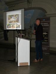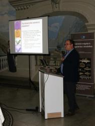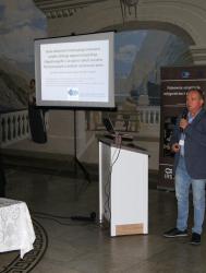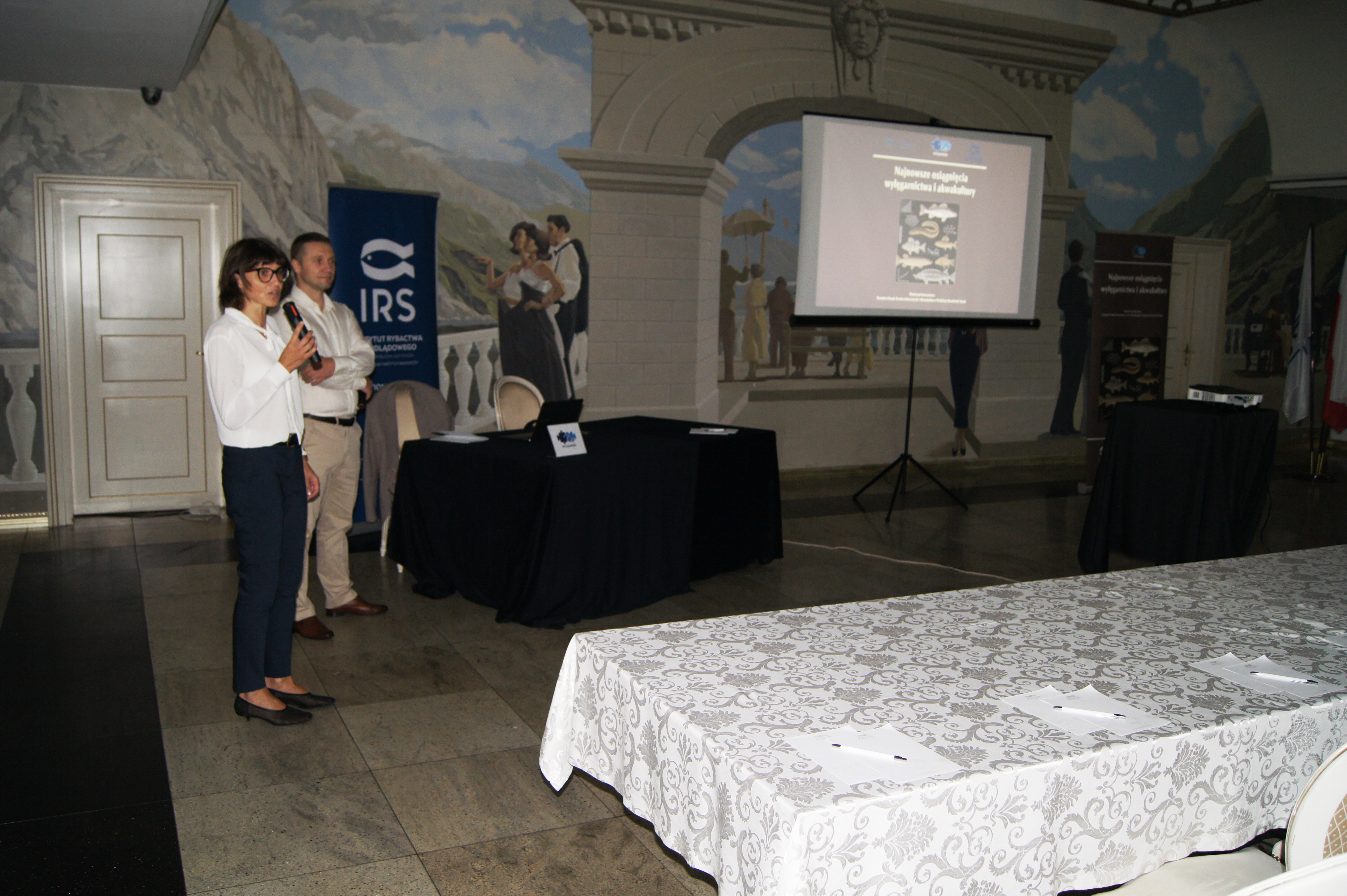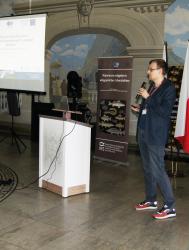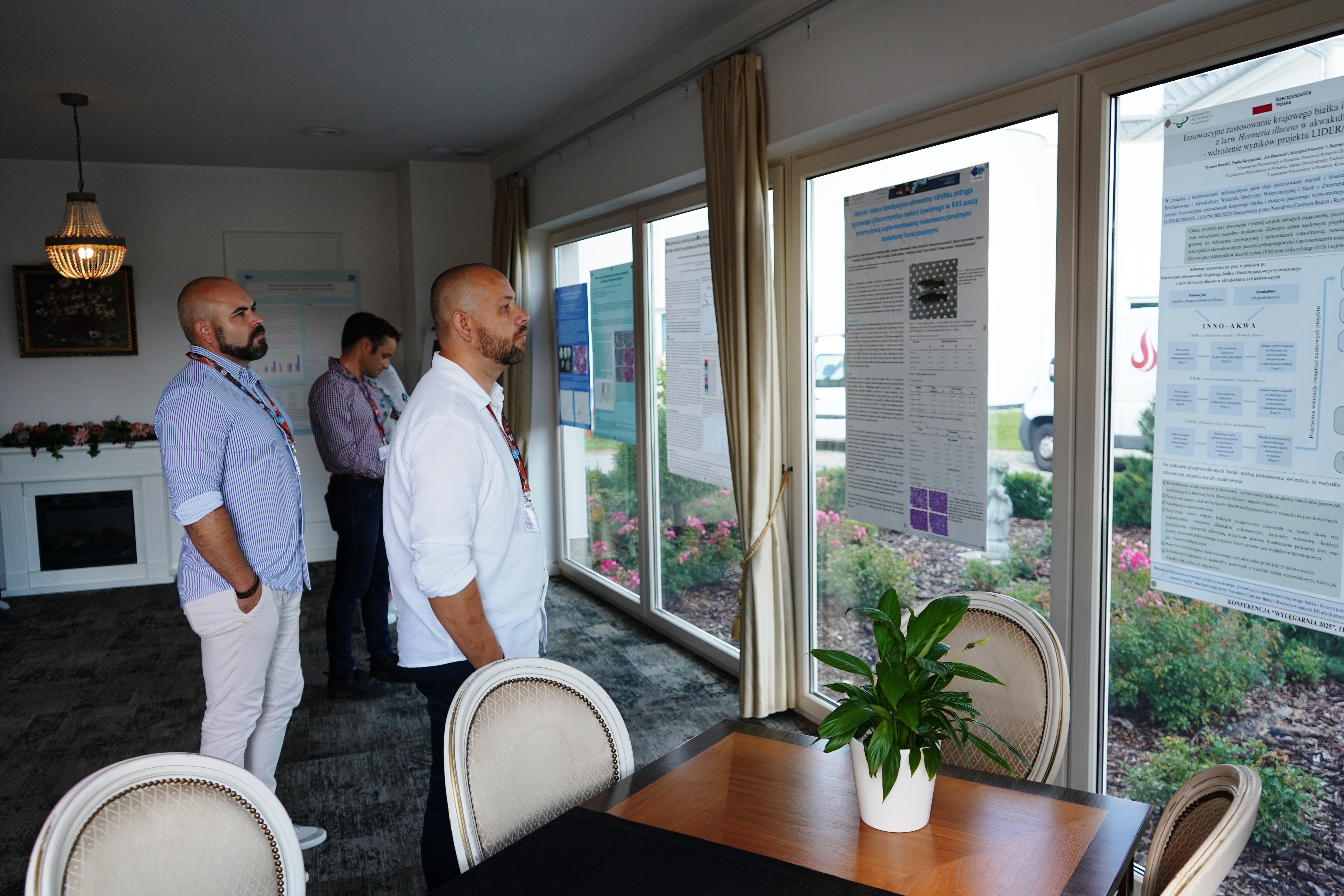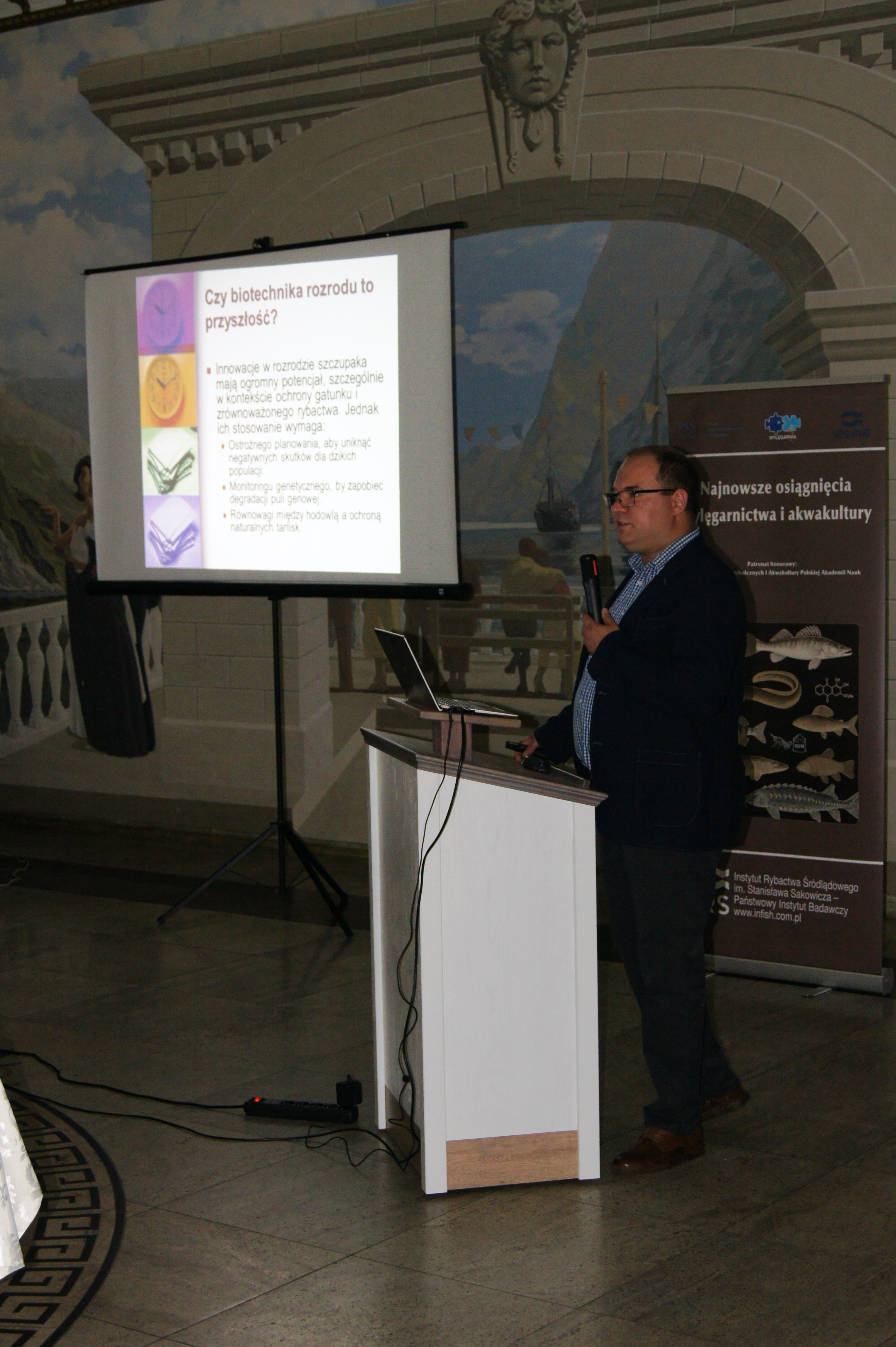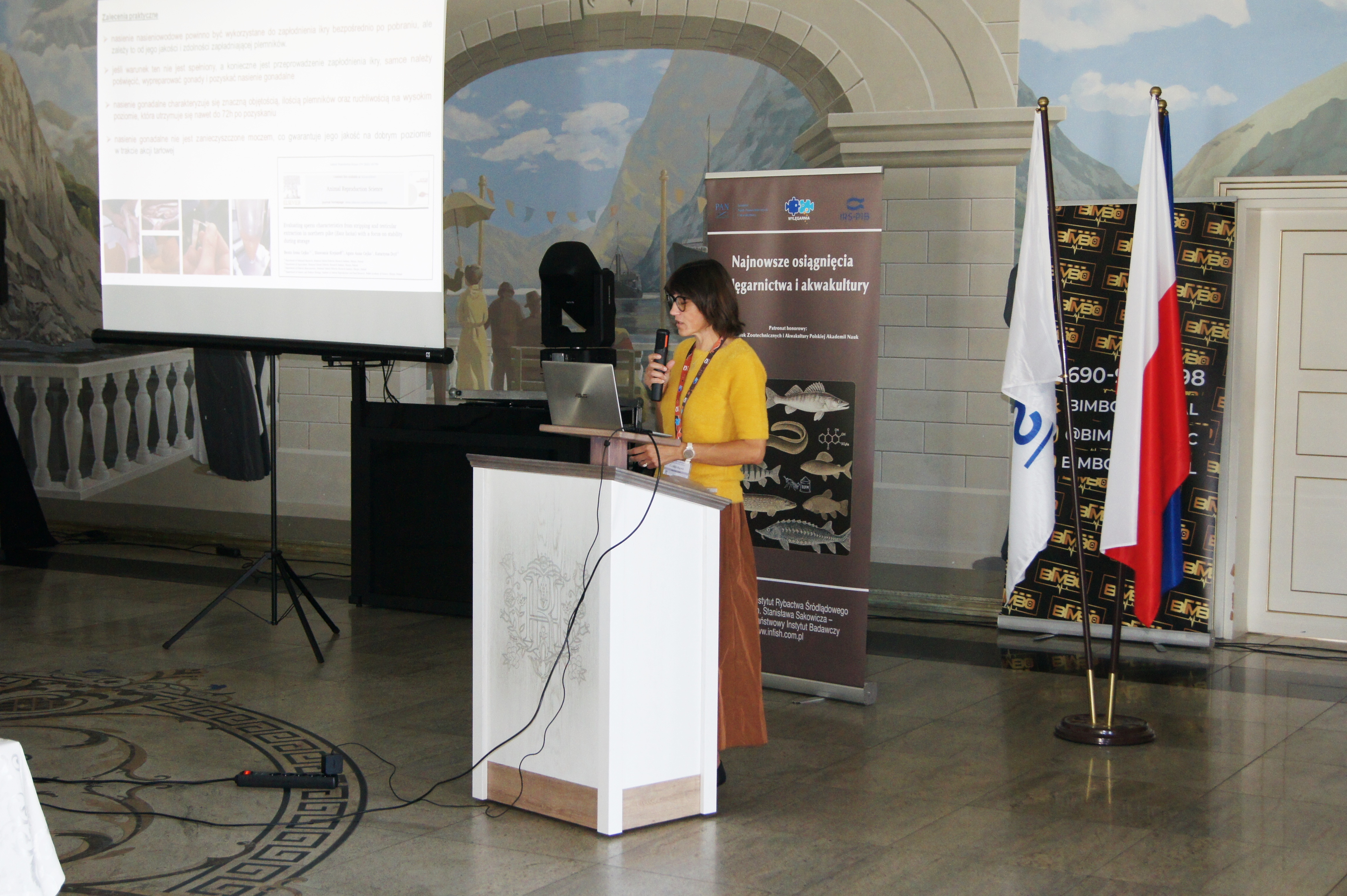Konferencja została otworzona przez dr Macieja Rożyńskiego oraz dr hab. Agatę Cejko, którzy podkreślili znaczenie integracji środowisk naukowych i hodowlanych oraz potrzebę wspólnego wypracowywania rozwiązań odpowiadających na dynamicznie zmieniające się warunki gospodarcze i ekologiczne (fot. 5). W ramach konferencji odbyły się trzy sesje referatowe, podczas których zaprezentowano łącznie 14 wystąpień naukowych. Pierwsza sesja, moderowana przez dr Macieja Rożyńskiego, poświęcona była zagadnieniom żywienia ryb oraz innowacjom w zakresie produkcji pasz. Dr hab. Agata Cejko przedstawiła wyniki badań dotyczących wpływu różnych źródeł lipidów na wzrost, zdrowie i jakość mięsa jesiotra (fot. 6). Szczególną uwagę poświęciła alternatywnym źródłom lipidów – takim jak olej z alg, amarantusa czy lnianki – oraz ich profilowi kwasów tłuszczowych, ze wskazaniem na korzystne działanie LC-PUFA (DHA i EPA) na odporność, parametry rozrodu i wartość odżywczą ryb. Dr hab. Piotr Hliwa zaprezentował badania nad immersyjnym znakowaniem narybku węgorza europejskiego (Anguilla anguilla) z wykorzystaniem barwników fluorescencyjnych – alizaryny red S i kalceiny (fot. 7). Obie metody cechują się wysoką skutecznością, brakiem negatywnego wpływu na przeżywalność i wzrost ryb oraz potencjałem zastosowania w praktyce hodowlanej i monitoringu populacji ryb. Kolejny referat, autorstwa dr hab. Jana Mazurkiewicza z Uniwersytetu Przyrodniczego w Poznaniu, dotyczył wykorzystania mączki z owadów (Hermetia illucens) jako zamiennika mączki rybnej w żywieniu jesiotra ostronosego (Acipenser oxyrinchus) (fot. 8). Wyniki badań wykazały przeżywalność młodocianych osobników na poziomie 100% oraz brak negatywnych efektów biologicznych, co czyni mączkę owadzią obiecującym komponentem paszowym w zrównoważonej akwakulturze. Następnie dr hab. Rafał Kamiński z Zakładu Rybactwa Stawowego w Żabieńcu IRS-PIB przedstawił wpływ dodatku kwasu solnego i chlorku manganu do paszy na wzrost, kondycję oraz występowanie deformacji ciała u młodocianego lina (Tinca tinca) w warunkach kontrolowanych (fot. 9). Autor wystąpienia podkreślił możliwość optymalizacji składu pasz w celu poprawy wyników hodowlanych. Po przerwie kawowej rozpoczęła się druga sesja, moderowana przez dr hab. Agatę Cejko. Dr Marek Trella z Zakładu Bioekonomiki Rybactwa IRS-PIB zaprezentował kompleksowe podejście do zarządzania populacją szczupaka (Esox lucius), uwzględniające aspekty ekologiczne, ekonomiczne i społeczne (fot. 10). Wystąpienie podkreśliło znaczenie racjonalizacji gospodarki zarybieniowej oraz potrzebę wdrażania innowacji w biotechnice rozrodu tego gatunku. Mgr Rafał Rożyński, doktorant Uniwersytetu Gdańskiego i pracownik Zakładu Hodowli Ryb Łososiowatych w Rutkach, przedstawił porównanie triploidalnych i diploidalnych osobników lipienia europejskiego (Thymallus thymallus) pod względem rozwoju gonad oraz markerów zdrowotnych (fot. 11). Wyniki sugerują, że triploidy mogą stanowić bezpieczne narzędzie w ochronie dzikich populacji tego gatunku. Kolejne dwa referaty wygłosili pracownicy Zakładu Akwakultury IRS-PIB. Pierwszy z nich wygłosił mgr Michał Cydzik i dotyczył on metod pobierania oocytów oraz wpływ rodzaju płynu aktywującego plemniki na efektywność rozrodu szczupaka (fot. 12). Natomiast drugi, wygłoszony przez dr Macieja Rożyńskiego omawiał znaczenie buforowania anestetyku MS-222 na przykładzie okonia (Perca fluviatilis) (fot. 13). Pierwszy dzień konferencji zakończył się sesją posterową, podczas której zaprezentowano 9 plakatów (fot. 14 i 15)